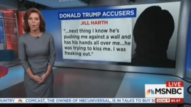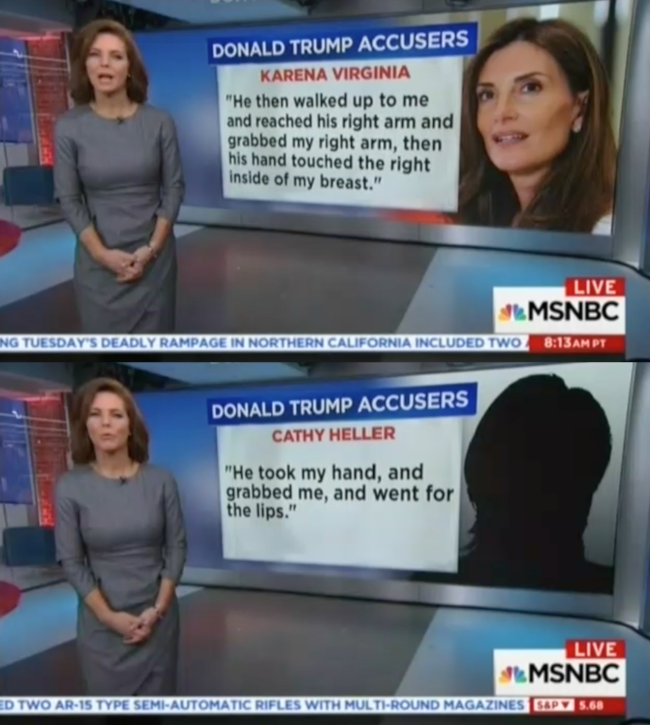 Media Matters for America broke down a recent MSNBC segment in which the women’s accounts—matched to their faces—lay bare the stark and undeniable scope of Trump’s transgressions. It is also excellent as a visual aid. It’s one thing to toss around numbers; it’s another thing to see each woman, to see the similarities of their stories, and read of the way that Trump violated them. Media Matters posted these screengrabs on their Tumblr, and you should look to a reblog if you’re on that platform.