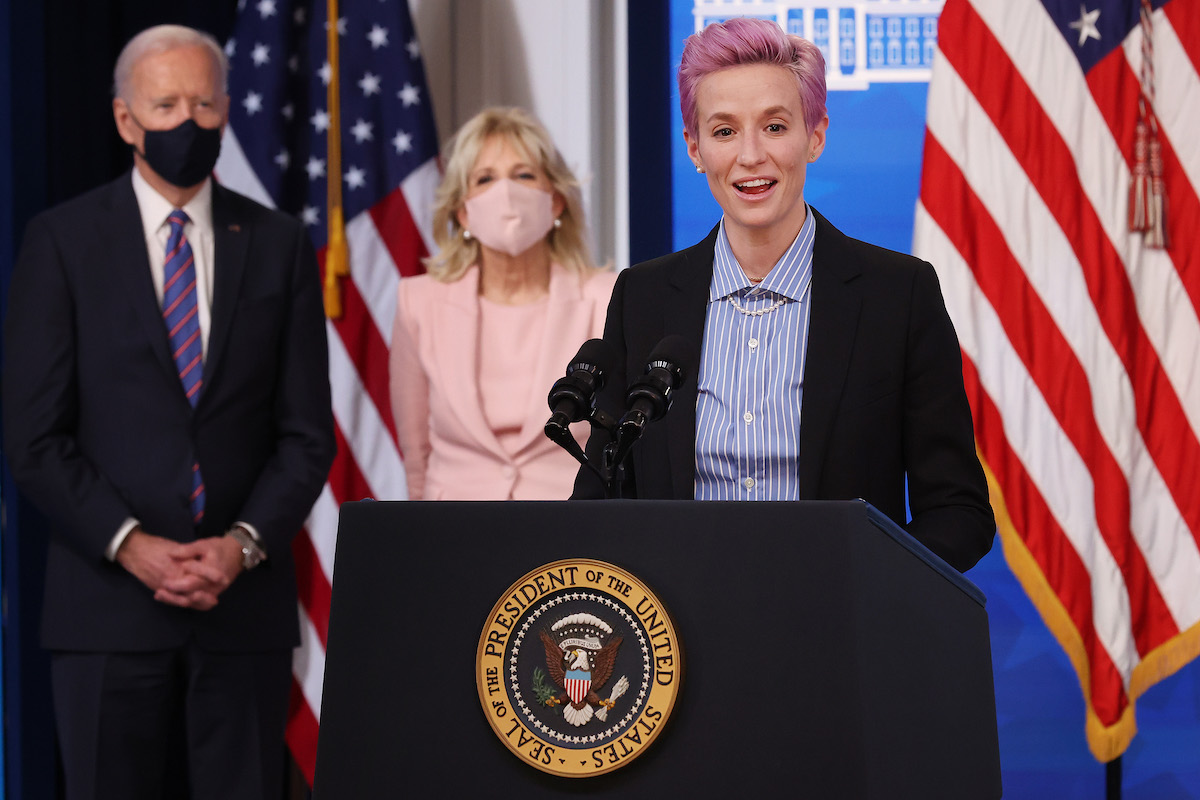 In 2021, after the US took home the bronze medal at the Tokyo Olympics, Trump described Rapinoe as the “woman with the purple hair” and said she played “terribly” because he believes she “spends too much time thinking about radical left politics and not doing her job.”