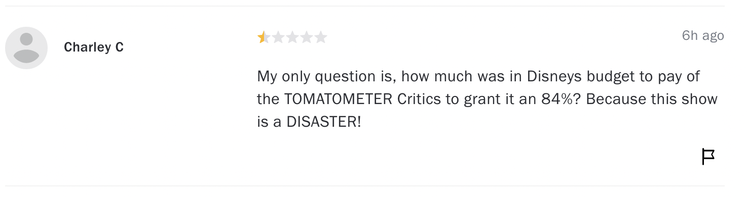 The complaints on Rotten Tomatoes all sound the same and, to be honest, most of them came from 6 hours ago and are filled with comments about the “ideology” of the original movie and how Disney is ruining it so … you know that it isn’t someone who genuinely cares whether or not the show is any good.