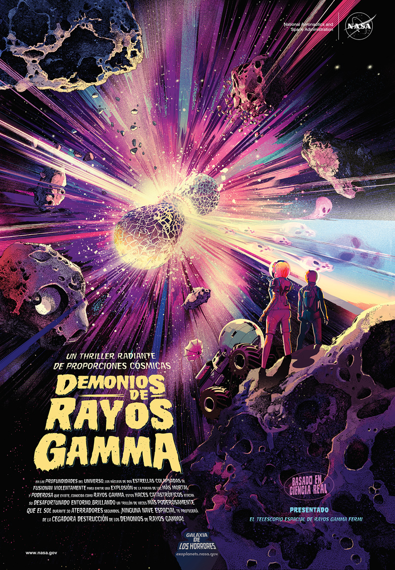 According to NASA, “As fun and creative as all three posters are, they’re based on real phenomena. In a dead galaxy, new star birth has ceased and most remaining stars are the long-lived variety, which are small and red, giving the galaxy a crimson glow. Likewise, when dead stars collide, they sometimes create a gamma ray burst, or the brightest type of explosion in the universe. And while dark matter may sound like it’s right out of a Halloween tale, its gravity keeps stars inside galaxies and hold groups of galaxies together in clusters – yet scientists don’t know what this invisible stuff is made of.” The posters are free to download, and are available in Spanish.