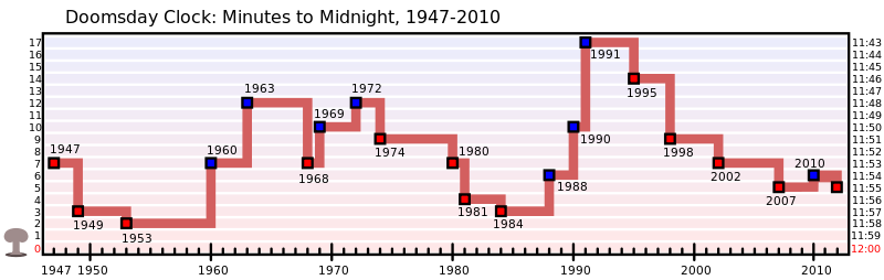 Of course, to get a feel for what this 11:55 setting really means, you need a little historical context. The Doomsday Clock was made in 1947 in acknowledgement of the horrific world-ending potential of nuclear weapons. Since then, it’s had a variety of settings, the vast majority of which are after “quarter to midnight.” The all-time high for optimisim, as far as the Doomsday Clock is concerned, was 1991, when it was set to 17 minutes following the dissolution of the Soviet Union. Most of the time however, it has hovered much closer to midnight. It was originally set at 7 minutes, but quickly fell to its all time low, 2 minutes, after nuclear tests by the United States and the Soviet Union.
