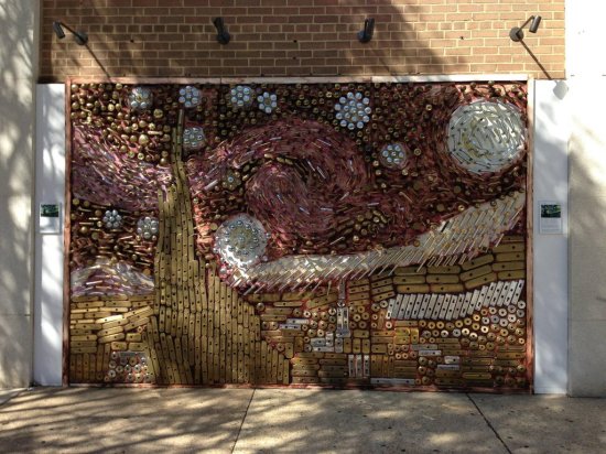 Created by David Goldberg, the Doorknob art adorns the wall of Union Hardware, in Bethesda, Maryland. The mural is composed of over 1,250 doorknobs, back plates, and levers, and is slapped onto PVC boards that was stained with PVC primer. Redditor MattMarks noted that the hardware store was under renovation, then the doorknob Starry Night popped up in two days.