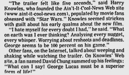 In anticipation of tomorrow’s Star Wars: The Force Awakens trailer premiere, Dorkly takes us all the way back to 1998, to see how people reacted to the release of the Phantom Menace trailer. Including gems like this: