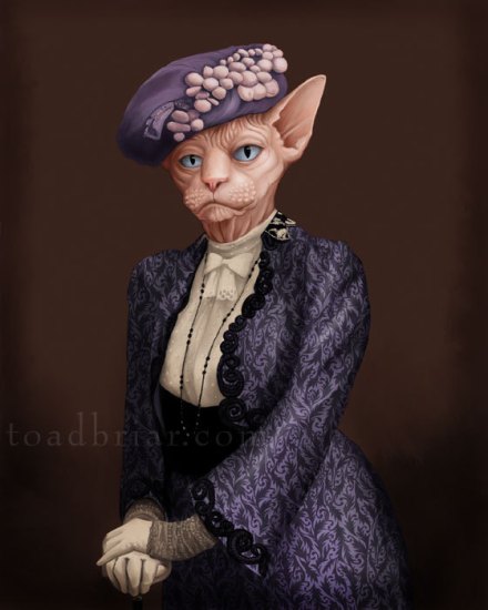 Toadbriar is an Etsy shop full of lovely animal portraiture, including, yes, a bakers dozen of characters from Downton Abbey reimagined as anthropomorphic domestic cat and dog breeds. Above, of course, the Dowager Countess.