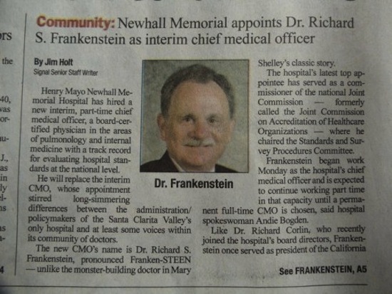 Dr. Richard S. Frankenstein is now an administrator at Henry Mayo Newhall Memorial Hospital, having been hired as an interim, part-time chief medical officer. Almost hilarious, since he pronounces the latter part of his surname “steen,” rather than “stine,” probably so it’s more difficult for the hospital staff to blame him when they find reanimated bodies walking around the halls.