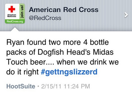 Last night, the above tweet appeared on the Twitter account of the American Red Cross, showcasing something pretty inappropriate for an emergency assistance humanitarian organization. The culprit of the odd tweet was simply someone who had access to the Red Cross Twitter account, and made a mistake using HootSuite. The Red Cross handled the situation pretty entertainingly–something that doesn’t happen much these days–and released a charming followup tweet. The best part about all of this, other than the calm (or cold, calculating and secretly terrifying?) poise of the Red Cross, is that the Red Cross managed to turn this digital faux pas into receiving donations (which further solidifies the calculating and terrifying theory), as Dogfish Head Brewery, whose beer was mentioned in the accidental tweet, encouraged donations.