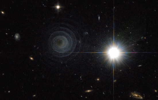 These death spirals aren’t generally discovered because the light from the red giant inside is being blocked by the spiral debris, so the partner star acting as a humongous space Spirograph isn’t the only odd bit of information regarding AFGL 3068: The astronomers studying the star believe the spiral pattern is visible because it’s being illuminated by galactic starlight. This means the star is in such a precise spot in the universe where the light of other stars, many light years away, actually reach the star with sufficient enough light left to make the pattern visible. Though the bright star in the picture above is situated on the brighter side of the spiral, astronomers aren’t yet sure if the star is situated close enough to the spiral pattern to provide any illumination.