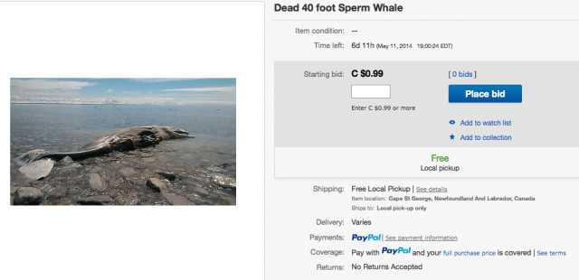 Unfortunately, this is one instance where eBay’s well-intended restrictions on the sale of marine mammals might do more harm than good. The town of 1,000 hasn’t been able to find an affordable way of removing the rotting sperm whale that washed ashore on their beaches last week, and Canada’s fishery department refuses to get involved. When Cape St.George’s town council met this Sunday, they decided to try a 21st century fix before the smell of the corpse became unbearable. Thankfully, The Telegram captured this bizarre screenshot before the eBay Gods intervened:
