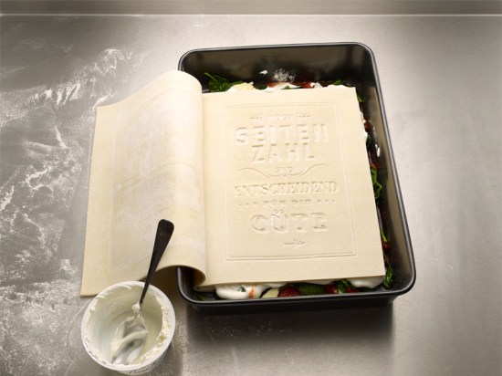 In what is likely the best use of pasta you’ll see today comes this cookbook from the Gerstenberg Publishing House. As the title implies, it’s a cookbook that you can eat. And we’re not talking just edible paper here — this is the big leagues. Each page of the book is printed on a sheet of delicious pasta, and the entire book is meant to be read and then baked as a lasagna. Finally, the perfect way to sate your literary and literal hunger.