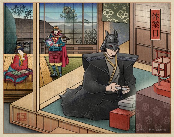 Chet Phillips decided to depict DC Comics’ Wonder Woman, Superman, and Batman as if they lived a long time ago in Japan. So why are the Trinity taking it easy when there’s obviously a monster to fight? The banner in the right corner reads: “Vacation Day.” You can purchase the print in his Etsy shop.