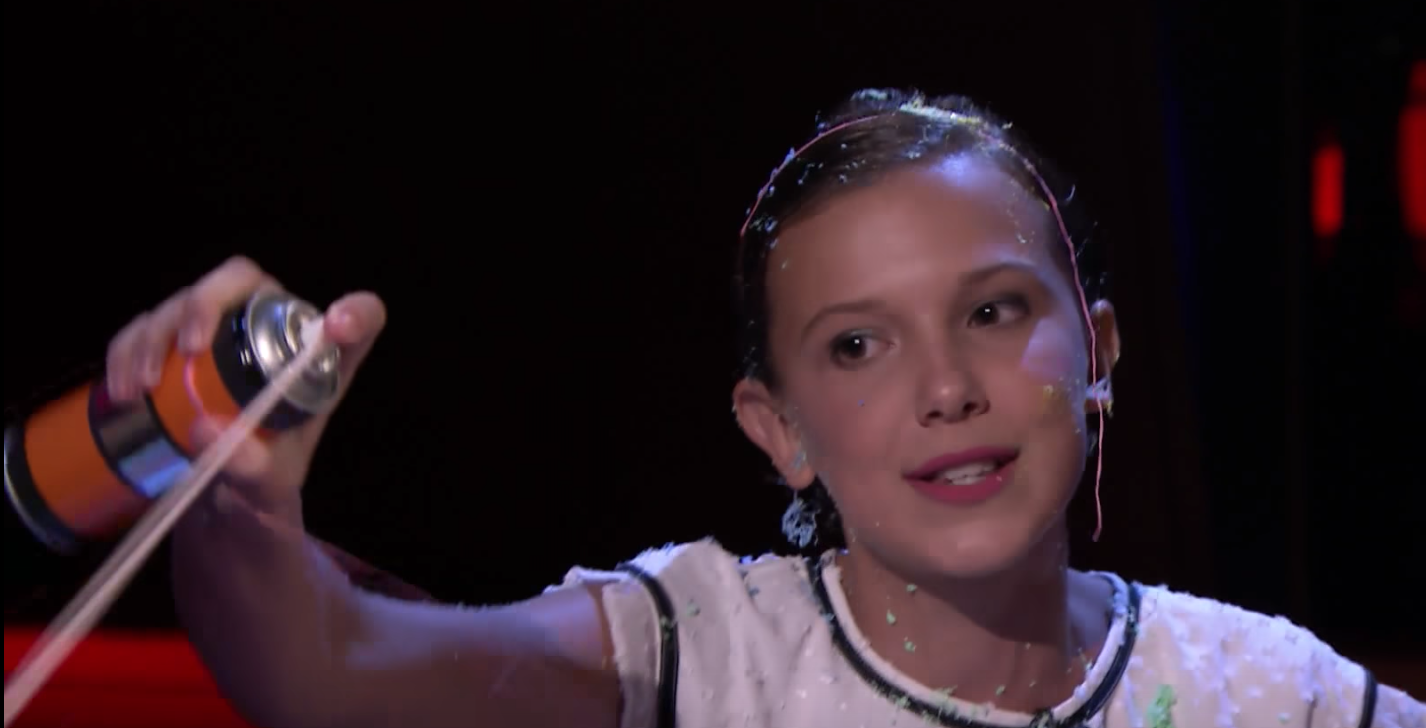 The kids of Stranger Things all sat at a round table with Fallon and, well, sprayed silly string on each other. Okay, it was a little more involved than that. Apparently before they show, they had all written down little-known facts about themselves on cards that were shuffled together. They would then read out random cards at the table. Here’s where the string comes in: they would shoot their silly string at the person they thought wrote the card. Seems simple enough, right?