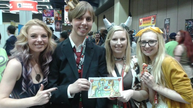 As I walked around the show floor checking out vendors and artists, I suddenly heard cheering in the distance. Not one to want to be left out of a good party, I hurried over toward the cheers and ended up at the table of artist Agnes Garbowska, who – along with actress, Jennifer Newman – had just helped facilitate a proposal by a charming young man named Nicolaj to his lovely lady, Christina, wherein he commissioned a drawing of his pony proposing to Christina’s pony.