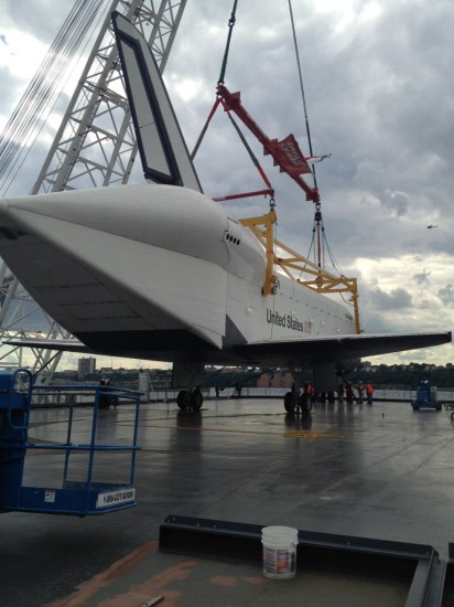 The Space Shuttle Enterprise made the last leg of its epic journey today and barged on over (literally!) to its new resting place on the deck of the Intrepid Sea, Air, and Space Museum. Like every part of the trip so far, the process has been equal parts awesome and complicated, but possible thanks to some true masters of logistics. Starting on June 19th, you’ll be able to go see the Enterprise in person, but until then, you’ll have to settle for these awesome shots of it settling in.