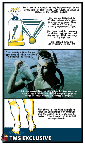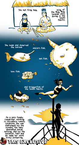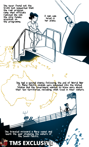 While Eugenie Clark was a force to be reckoned with, the purpose of this comic is to contextualize her experience through an intersectional lens. While racism and sexism were a part of her daily that culminated in her becoming one of the most valued voices in her field, curiously, U.S. imperialism was also a part of her world, and she benefited from it in the context of her work. It’s important to acknowledge an injustice, whether it’s just a footnote, or a part of someone’s story of self-actualization.