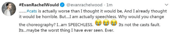 Cats! The Tom Hooper-directed movie adaptation of Andrew Lloyd Weber’s infamous musical has been getting such wildly terrible (and yet somehow wonderful in their horror) reviews that it almost makes me want to see what Hooper has wrought. Westworld actress Evan Rachel Wood had quite the reaction to watching the Jellicle cats in action.