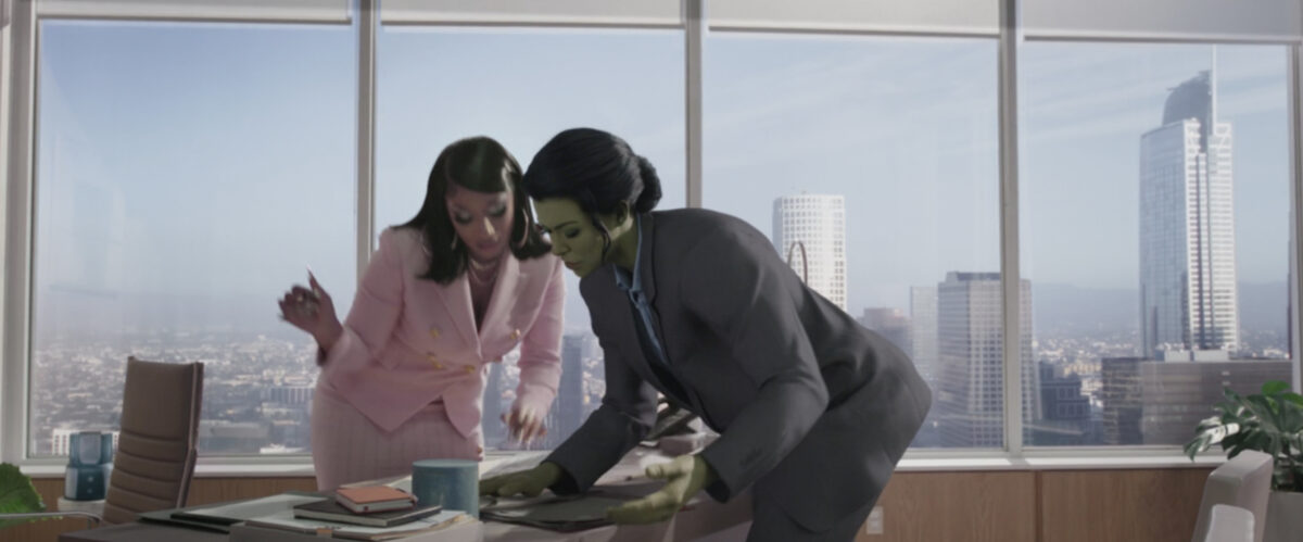 If you really want to impersonate Megan Thee Stallion, you’d better be ready for her to show up at your court case and laugh at you. Megan Thee Stallion showed up in the actual episode, but what we saw in the mid-credits scene was that she became one of Jennifer’s new clients! The scene starts with Jen walking into her office and saying that there’s her new favorite client, and it’s Megan Thee Stallion! Jen has her signing papers, and the two are leaning over Jen’s desk together.