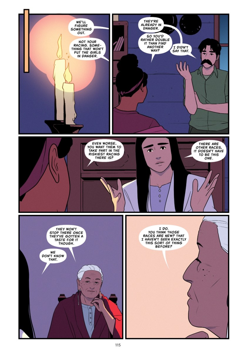 Then there’s Cheng-Kwan, a trans girl who relies on broom racing as a safe space where she can be herself since she can’t come out to her parents. Choctaw racer Mattie and Black racer Emma are the youngest of the group, desperate to avoid the government officials who will send them to boarding school to learn how to control their newly-surfaced powers. Last, but not least, there’s Luella, whose powers were taken when she fought against the government years ago. She’s in love with Billie and fiercely protective of her loved ones, who risk the same if they don’t toe the line.