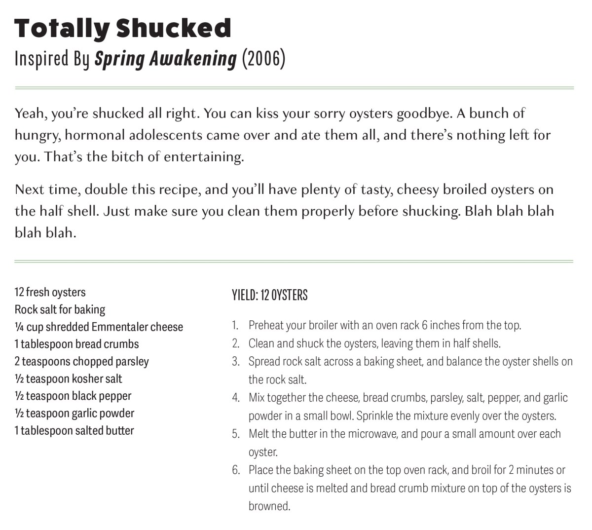 Now about those Spring Awakening-inspired oysters. Spring Awakening, the Duncan Sheik/Steven Sater rock musical based on an 1891 play by Frank Wedekind, is full of raging hormones and heaping doses of angst. One of the show’s stand-out songs (of many!) is called “Totally F*cked,” which is how we arrive at “Totally Shucked.” And what more fitting dish to prepare than oysters, that alleged aphrodisiac? Cheesy broiled oysters, you say?