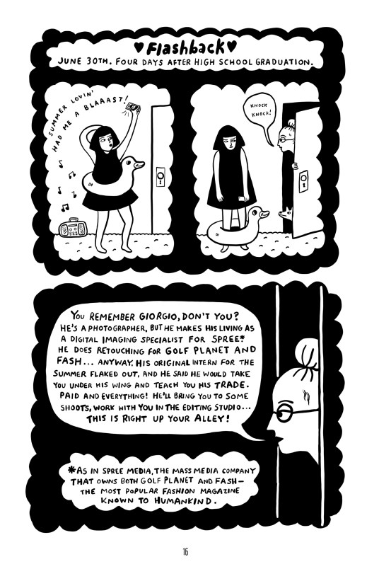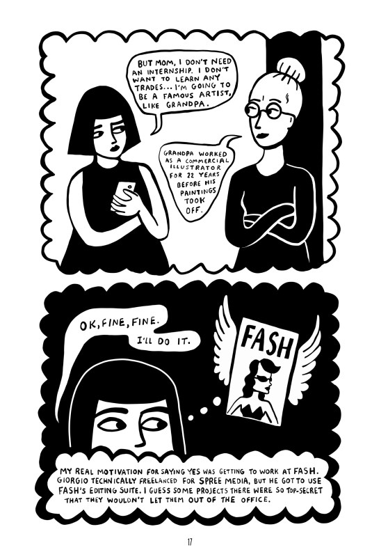 Though Olive’s story is very similar to Szamosi‘s internship ten years before and ten years younger, this is not a graphic memoir. Where Olive lands the internship via her mother, Szamosi found her experience through a friend “who was sick of hearing me complain about bartending.” This friend’s boyfriend was a photo retoucher and connected Szamosi with a position at a similar place where Olive ends up.