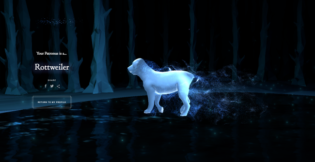 When the quiz asked me to think of my happiest memory, I thought of my dog Big Mama Janksy. My Patronus turned out to be a Rottweiler! Although Big Mama was an English Mastiff, they’re both big, lovable dogs who’ll do anything to protect their human companions.
