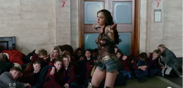 We see Diana involved in some badass fighting, and also watch her protect a group of terrified school children with her gauntlets.