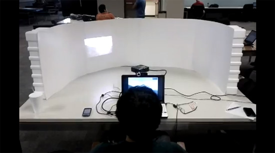 The best way to get really visually sucked into the game you’re playing is to increase screen real estate; get a giant HDTV or a series of monitors. But a team from the University of Texas, Austin has unveiled a clever solution that uses a tiny projector to provide a huge viewing experience. In their demo, presented last week, they combined a tiny, motorized pico projector and an eye-ball tracking system with a parabolic screen. This keeps gamers’ eyes on the action no matter where they look, and incorporates some unique Kinect-like controls to the game. Head on past the jump to see the demo in action.
