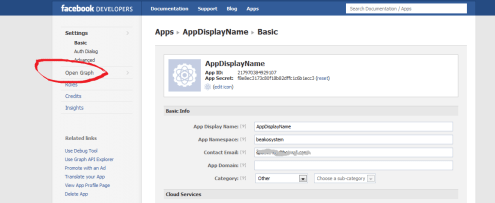 - You should be on your new app’s page. Go to the left-hand tool bar. “Settings” should be selected. Underneath its sub-options there should be an option “Open Graph.” Click that.