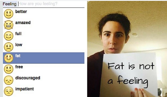 Catherine Weingarten launched a Change.org petition last month to coincide with National Eating Disorders Awareness Week, asking Facebook to remove ‘feeling fat’ from the site: “Fat is not a feeling. Fat is a natural part of our bodies, no matter their weight. And all bodies deserve to be respected and cared for.”