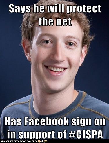 If you remember point number three in our little CISPA primer, you know that one of the bill’s problems is its overzealous protection information sharing. CISPA makes all sharers of cybersecurity information exempt from both federal and civil suits considering that CISPA supersedes all information privacy laws. If you were Facebook, wouldn’t you want to be protected from federal and civil suits whenever you can be? Especially when you are sharing information with the government, a touchy thing that you probably already do? Of course you would.