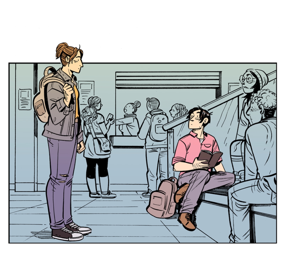 Hicks, who identifies as bisexual, says her intent with Hockey Girl Loves Drama Boy wasn’t to necessarily “reverse gender roles,” but to write “characters that spoke to me and characters I thought would be just really interesting to bring together and see where their stories went.” However, it’s rare to see an openly bisexual teenage boy in fiction, and Ezra’s story makes this queer romance comic stand out because of that.