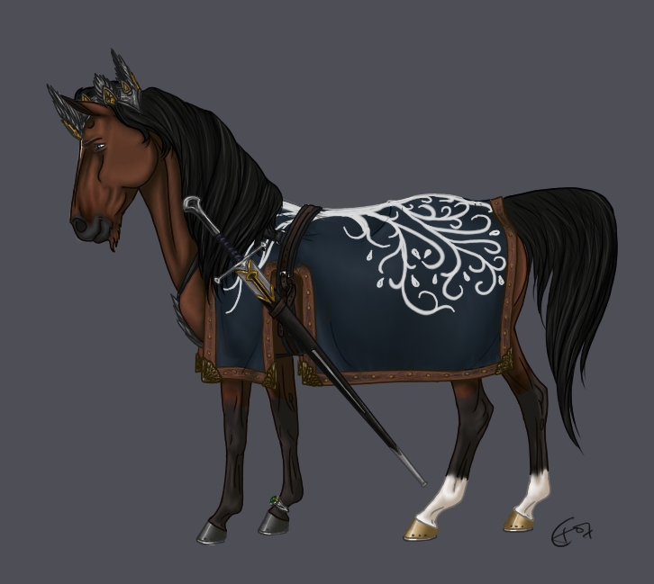 Silverglass19 (aka Liz) on Deviantart is really, really good at drawing ponies. I’m not talking MLP style, either, though those also take a lot of skill most of us don’t have — I mean anatomically correct horses you feel like you could totally ride. Not that the heir to Isildur would let you just jump on his back all willy nilly, though. He would totally show you the meaning of “hell no” if you tried to pull that stunt.