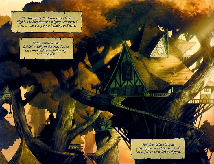 If you’re ever in Solace, make sure to pay a visit to Inn of the Last Home, a beloved institution known for its food and for regularly hosting The Heroes of the Lane. The inn has had many different owners in the hundreds of years since it was built by Kale the Strong in the branches of a vallenwood tree. During the War of the Lance, the inn was lowered to the ground and dragonarmies burnt the tree in which the inn sat. Following the war, the inn’s then-owner Otik planted a new valennwood tree to house the inn for future generations. To this day, its distinctive appearance and hearty food and drink continue to provide welcome hospitality for weary travelers.
