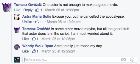 Tomasz makes a good point that even amazing actors can’t fully save a bad script, but after Astra’s reminder about the cancellation of the apocalypse, the discussion was over before it’d begun. Check mate.