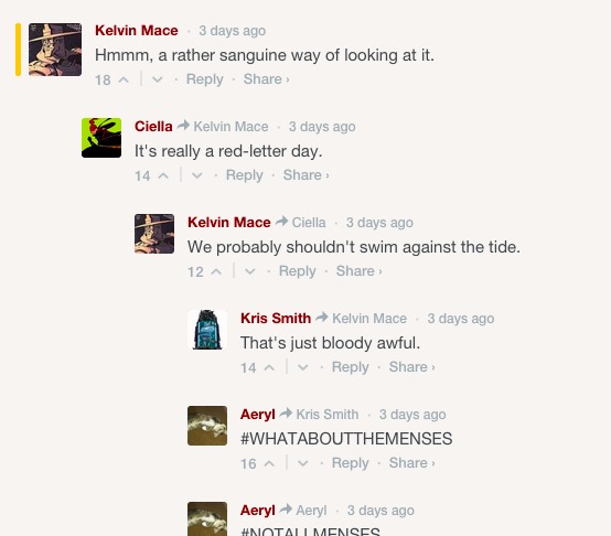 And of course, Cate Blanchett teld the world that menstruation and a desire to watch movies aren’t related, and the period humor from the story bled over into the comment section for our requisite pun thread: