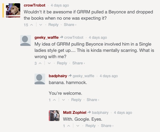 Game of Thrones‘ upcoming seasons are set to spoil the books for fans who are into both versions, unless George R.R. Martin steps in like this, of course, which we could see ourselves getting behind: