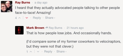 This is a true workplace hazard. The Mary Sue editorial team communicates almost exclusively by chatroom, and we prefer it that way. When I tried to ask a question with my actual human voice once, it incited editor-in-chief Jill Pantozzi to gnaw off my left thumb. True story.