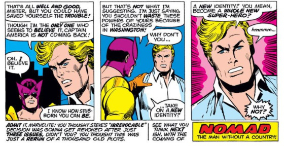 When America commits actions and atrocities beyond the pale, Cap isn’t afraid to renounce the star-spangled mantle entirely, becoming Nomad, the man without a country. He isn’t afraid to disagree with the authorities—or his closest allies—to stand by what he believes to be right.