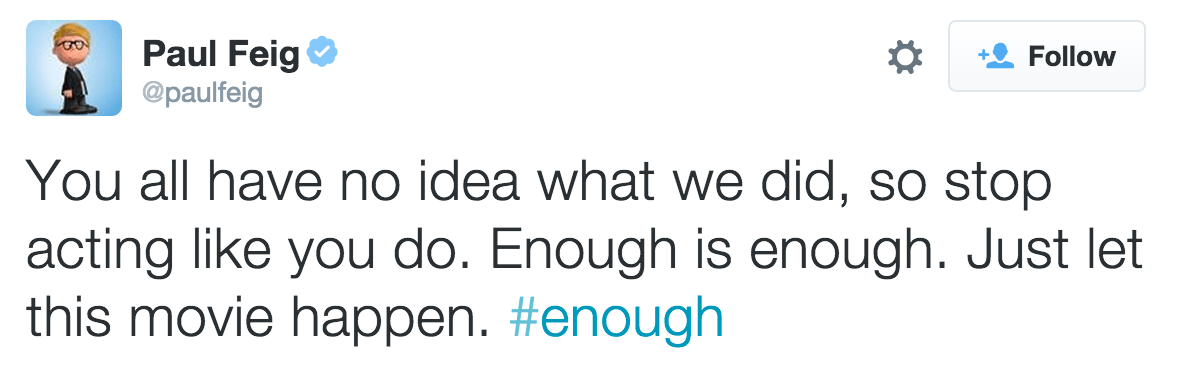 Paul Feig responded to what we can only imagine is a veritable legion of bitter people who are angry about the new Ghostbusters movie. He tweeted to all of them (can a tweet to an anonymous horde be a subtweet?), asking that they just let this movie happen.