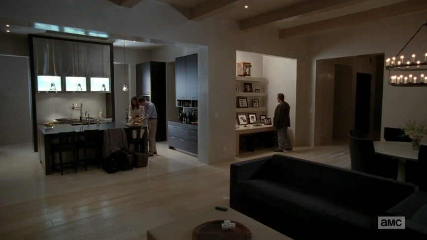 As oblivious as the Schwartzes are in this scene, they do eventually figure out that Walt is there when Gretchen turns around and suddenly sees him eyeing the family photos on their mantle. “Hello Gretchen. Elliot. I really like your new house. Are we looking east? You must have one great view.” This is officially the most out-and-out villainous we’ve ever seen Walt. He’s here to give them something, he says — but it’s in his car. As the audience, we know that all he’s really got is the money. The Schwartzes do not know this, however, so they’re clearly fearing the worst. Elliot even brandishes the tiniest of cheese knives at Walt as a defense, but Walt is completely unfazed.  “If we’re going to go that way, you’ll need a bigger knife,” he says. Yeah, the one Skyler had two weeks back was at least three times that size.