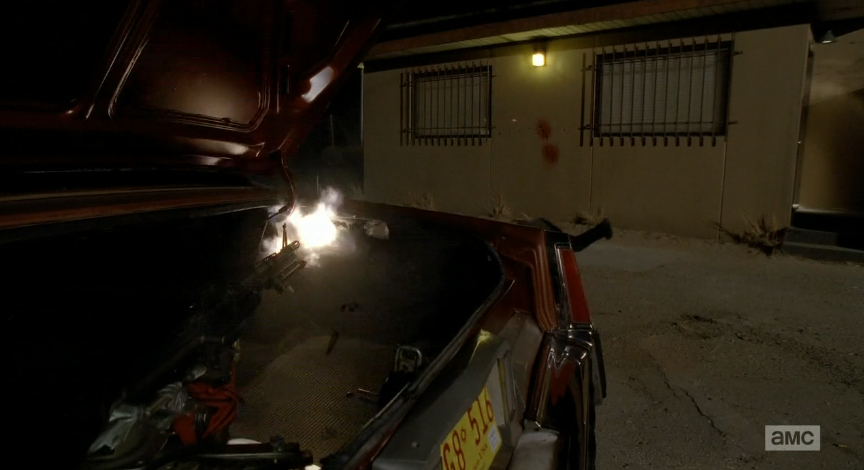 Back to the iconic New Mexico landscape. Walt is in the desert playing around with something mechanical. It’s pretty obvious that he’s looking to automate his M60 so that it goes off when he hits the button on his car keys. While he’s working, his wedding rings hangs in front of him on the string — he looks at it for a second, then returns it to the inside of his shirt so that the Ringwraiths don’t get it.