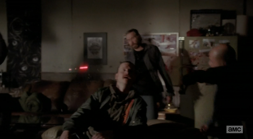 Outside, Walt is flashing his taillights in the darkness. Two men jump out of the bushes and YES IT’S BADGER AND SKINNY PETE. They’ve both got laser pointers. Oh my gosh, you giant dorks, I knew that hitman thing was too contrived to be real. Badger and Skinny Pete feel weird about what just happened — “the whole thing felt kinda shady, morality wise?” Pete says. Then Walt throws a bunch of money at them, and they forget what they were just walking about.