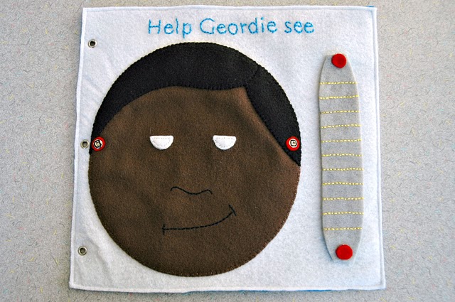 Maybe you remember these from your childhood: the sturdy cloth object (maybe a book, I think I had a stuffed cube) covered in various fasteners, zippers, and pockets, specifically designed to take a bored or fussy toddler and engage them in opening and shutting, zipping and unzipping, and learning how to do things like lace shoelaces or button buttons.