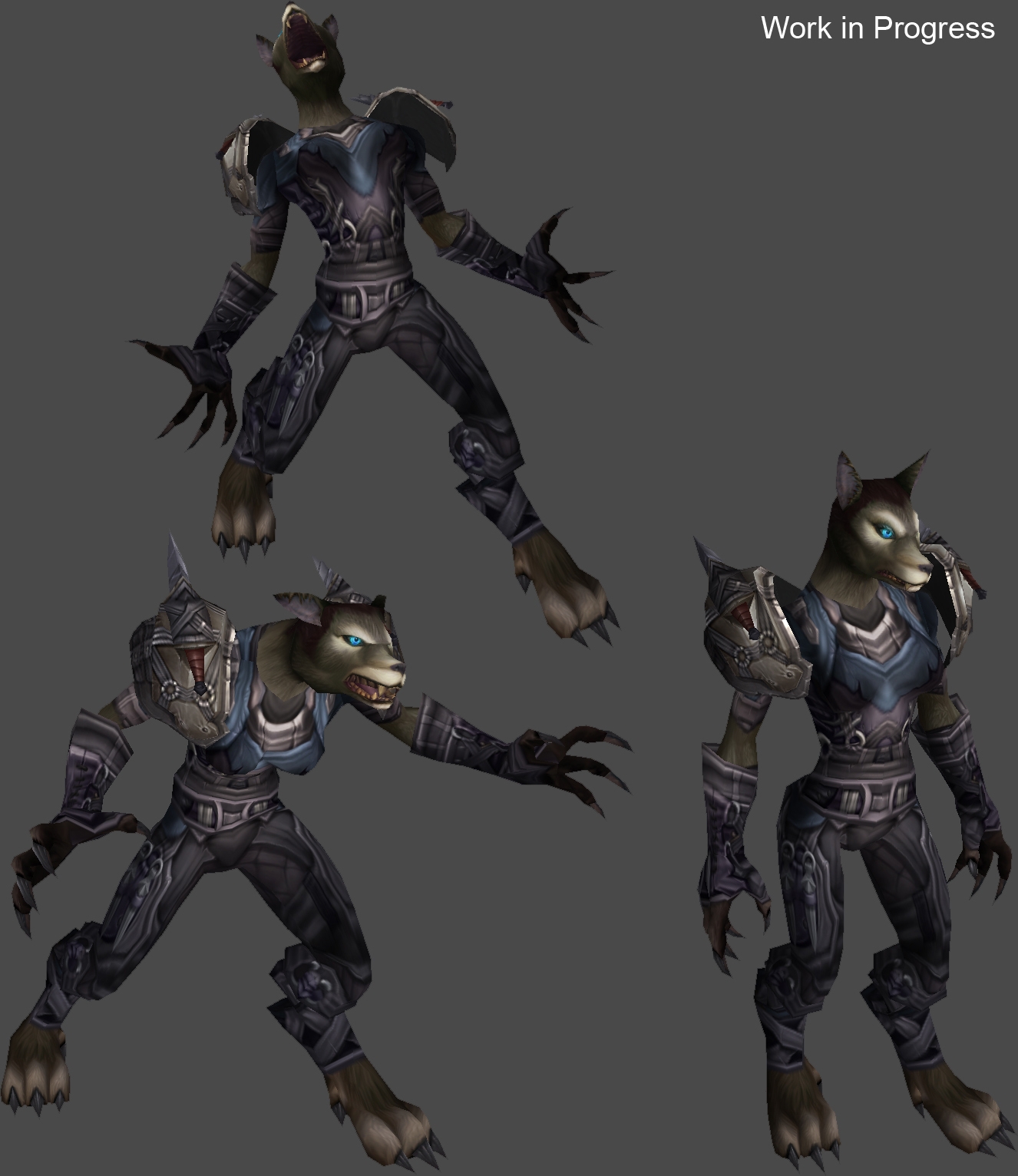 The Escapist is the lucky blog that’s been graced with the scoop; four pictures of lady Worgen dressed in each of the four armor categories in the game (plate is pictured above). All worgen will have two forms available to them: while out of combat they have the option of reverting to human.