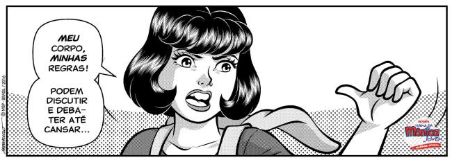 Leão’s book tells the stories of the child characters aged up a little bit, and it has a similar vibe to Archie comics. In last month’s issue, she wrote a storyline in which the titular Mônica, who’s considering braces, stands up for herself as some people make fun of her buck teeth, and says that she won’t change her appearance for anyone. It’s a great moment of teen empowerment. However, it’s one phrase she utters in particular that got conservative folks in an uproar, particularly when the phrase was singled out: