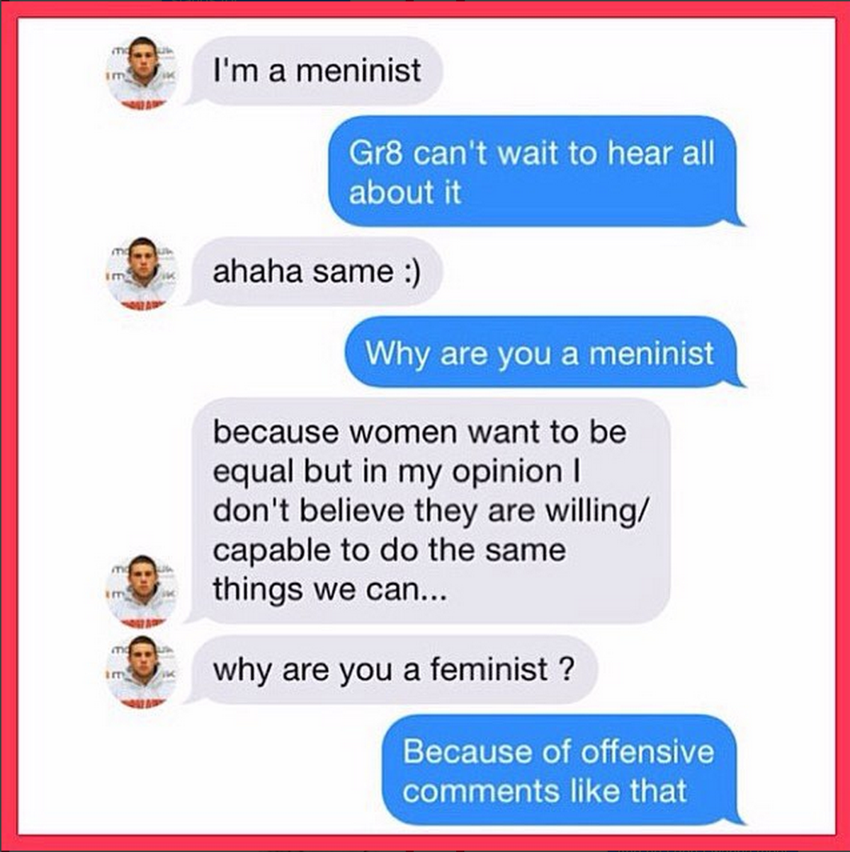 Here’s a fun drinking game as you peruse the screenshots (and comments!) posted on the @feminist_tinder Instagram account: take a drink for every time someone says they’re a meninist. Take a shot every time someone says “bitch.” Finish your drink for every guy who suggests reverse racism exists and that white men are under attack.