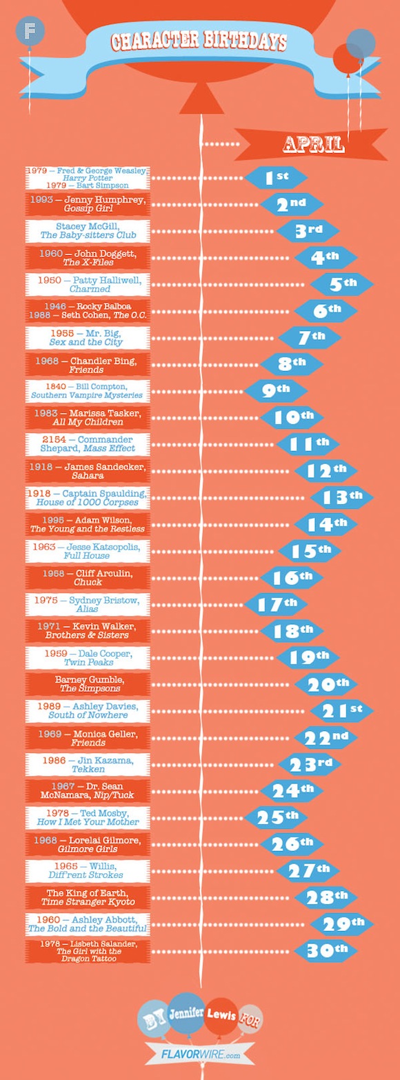 Flavorwire has prepared a year round collection of fictional birthdays, so if you weren’t born in April you’re probably going to want to look up who shares your birthday.
