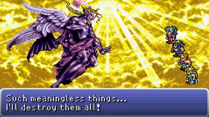 Kefka rejects the other characters’ protests that even in the ruined world there are still things worth caring about. Oddly, this was one of the selling points of this villain for me, even when I was a teenager. Maybe it was the music or the length of time we had to get to know Kefka and follow the stages of his rise to godhood. I started to understand him. I understood why, given all of the things that had happened to him during his life, he would come to the conclusions he did. And I understood why, given the level of power he had achieved, he would choose to end it all.