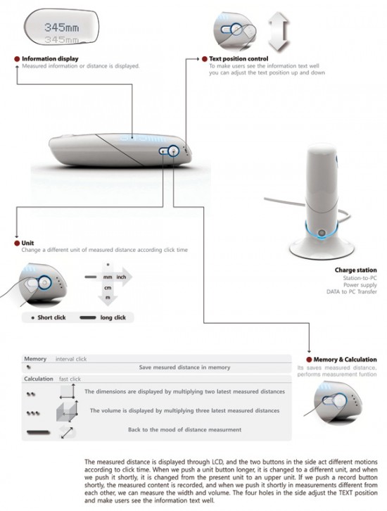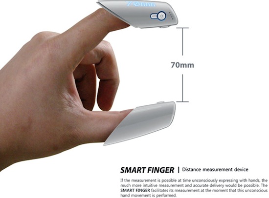 The Smart Finger is a very neat concept device from designers Choi Hyong-Suk, Jung Ji-hye & Yoo-Jin Park that consists of two wearable silicon finger-covers that let you measure the length, breadth, or volume of any object. For small objects, you’d wear both sensors on one hand; for larger objects, you’d wear one sensor on each hand. While we don’t want for measuring tools in this day and age, the designers’ logic is that a measurement device based on and integrated with the human user’s own measurements would fall in line with a long tradition of measuring things in terms of our bodies, and that the Smart Finger measuring process would thus be more intuitive and less annoying than other measuring tools and digital measuring intstruments.
