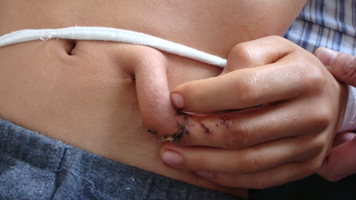 The bit circled in red is clearly where the finger has been stitched to the, well, the um…what is that thing? It seems as if he just has a naturally occurring thumb-esque mass already protruding from his stomach. You can see where the finger and the “thing” were stitched together, but there doesn’t appear to be any evidence of surgery around the base of that thing circled in yellow. I mean, this idea of this surgery was to promote tissue growth, but that can’t be the tissue growth we’re talking about, right? What is that thing? It’s way more than a fingertip.