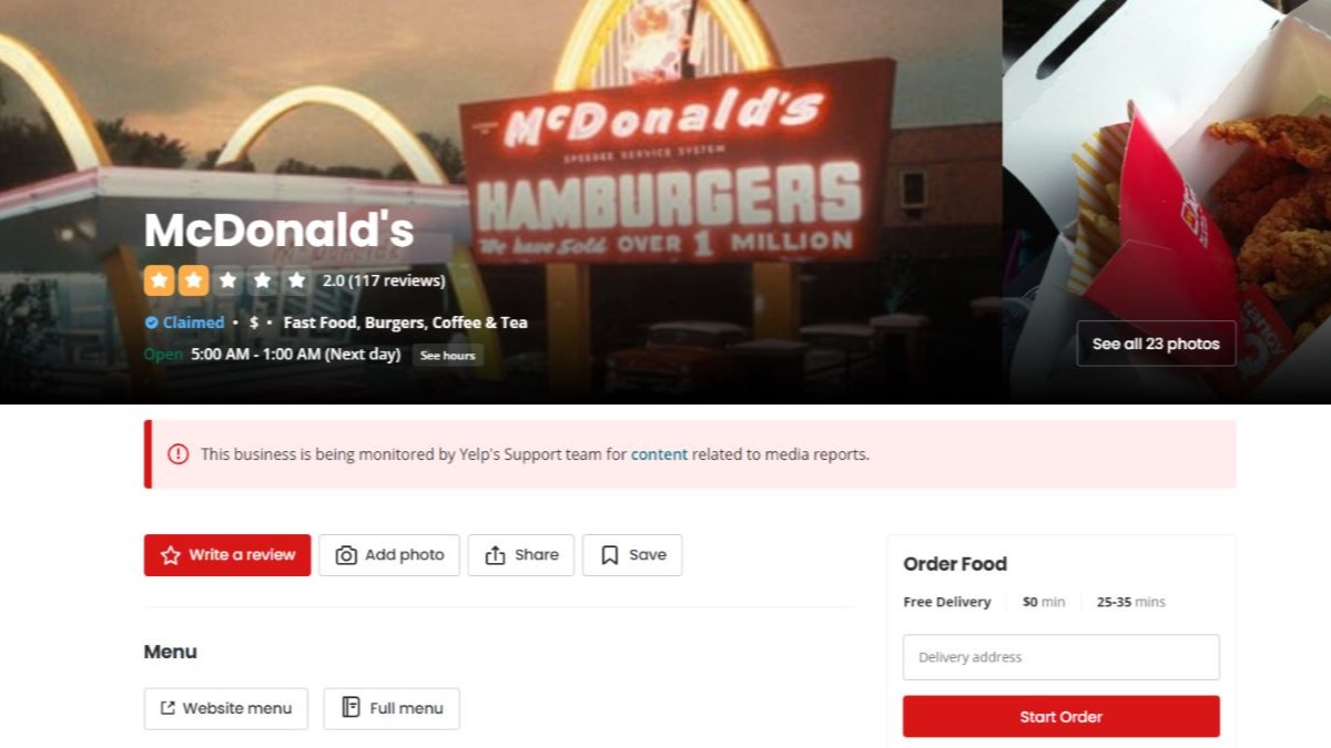 The McDonald’s Yelp page is currently under attack. When opened, Yelp notifies that the business “recently received increased public attention” and has disabled reviews for now. If you happened to stop by and received fries with bronzer from a suspicious orange man recently, you’ll just have to visit the page later to drop that one star review. Currently, the McDonald’s at Feasterville-Trevose sits at two out of five stars.